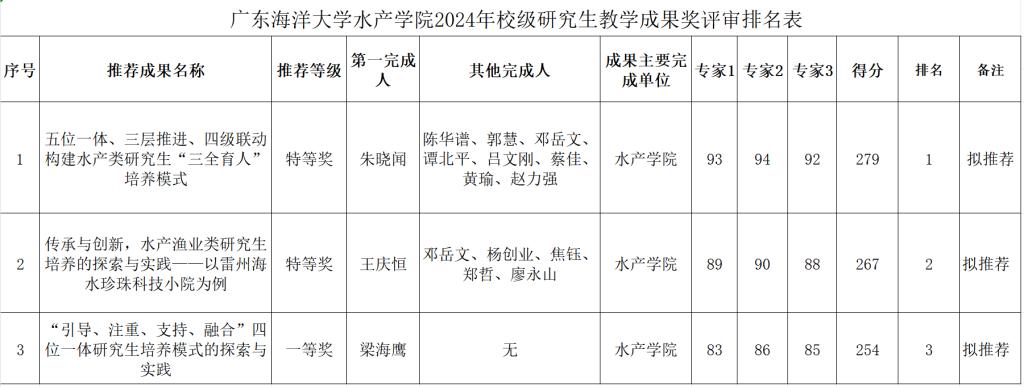 根据学校《关于开展2024年校级教学成果奖评选工作的通知》校教务〔2024〕103号要求,学院组织了申报和推荐工作。经个人申报、校内外专家评审、学院教授委员会审议,拟推荐《五位一体、三层推进、四级联动构建水产类研究生“三全育人”培养模式》等3个项目到学校遴选,详情见附件。