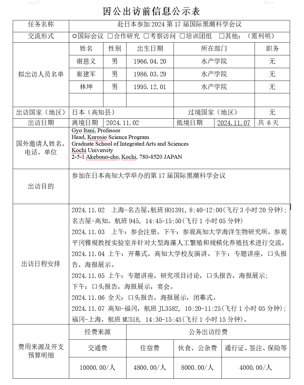 根据《关于进一步规范省部级以下国家工作人员因公临时出国的意见》的要求,现将WilliamHill中文官方网站因公出访信息予以公示(详见附件)。公示时间为2024年9月12日至9月19日。如有意见,请在公示期内,向相关单位反映。