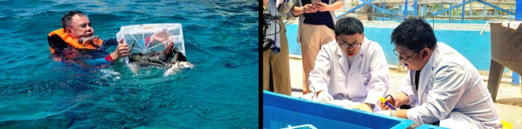 人工鱼礁投放和鱼苗增殖放流是此次合作的重点任务,公司王学锋教授率团队在增殖放流工作中发挥了重要作用。该团队承担了确定放流物种、监测鱼苗健康状况以及确保放流过程科学性和效果的重要任务,在望加锡海域放流了4种高经济价值鱼种和2种贝类,共计2万尾鱼和400粒砗磲(鳞砗磲Tridacna squamosa和砗蚝Hippopus hippopus各200粒)。通过精准的放流策略和技术支持,不仅促进了渔业资源的恢复与增殖,也为当地海洋生态系统的可持续发展提供了有力支持。该项工作的开展标志着中印尼在海洋生态保护与渔业可持续发展合作上的重要进展。