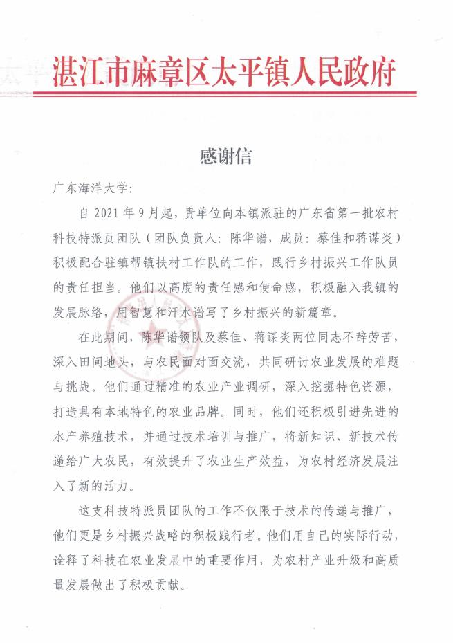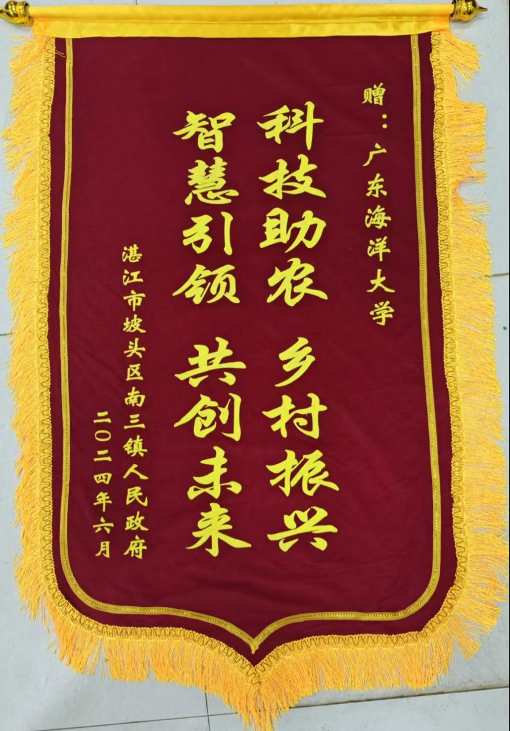 近日,william威廉中文官网收到来自湛江市麻章区太平镇人民政府的感谢信及坡头区南三镇的锦旗,对学院派出的两支广东省农村科技特派员团队做出的突出贡献表示感谢。