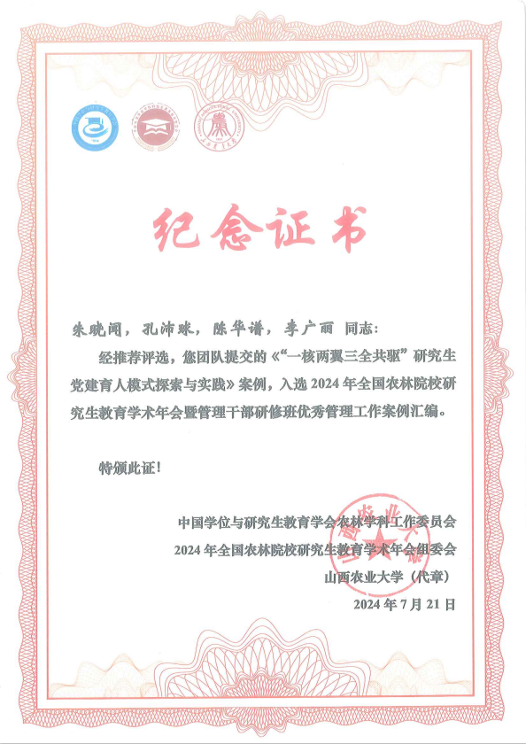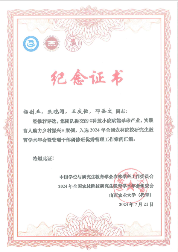此次会议共遴选了74个优秀培养案例,公司朱晓闻等撰写的《“一核两翼三全共驱”研究生党建育人模式探索与实践》,杨创业等撰写的《科技小院赋能珍珠产业,实践育人助理乡村振兴》成功入选,充分展示了公司公司产品的特色与亮点,受到全国农林高校的广泛关注和认可。