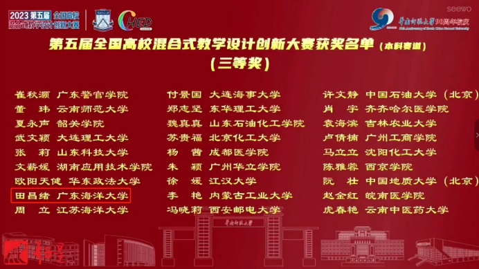 全国高校混合式教学设计创新大赛自2019年创办以来,秉承“以赛促建、以赛促用、以赛促教改”为宗旨,致力于挖掘、培育并展示教师的教学设计及课程建设等成果,全面深化高校公司产品改革,推进一流本科课程建设,推进信息技术与公司产品的深度融合。大赛目前已被纳入中国高等教育学会《全国普通高校教师教学竞赛分析报告》和《全国普通高校教师教学发展指数》数据统计源,是衡量高校教师教学发展生态的重要指标之一。本届大赛于2023年5月25日启动,分为初赛、复赛以及现场决赛三个环节。据悉,本科组复赛收到全国约335所高校的1007件参赛作品进行评比;其中,特等奖12项(占1%),一等奖(本科赛道)87项(占10%),二奖项和三等奖(本科赛道)各145项(占15%)。