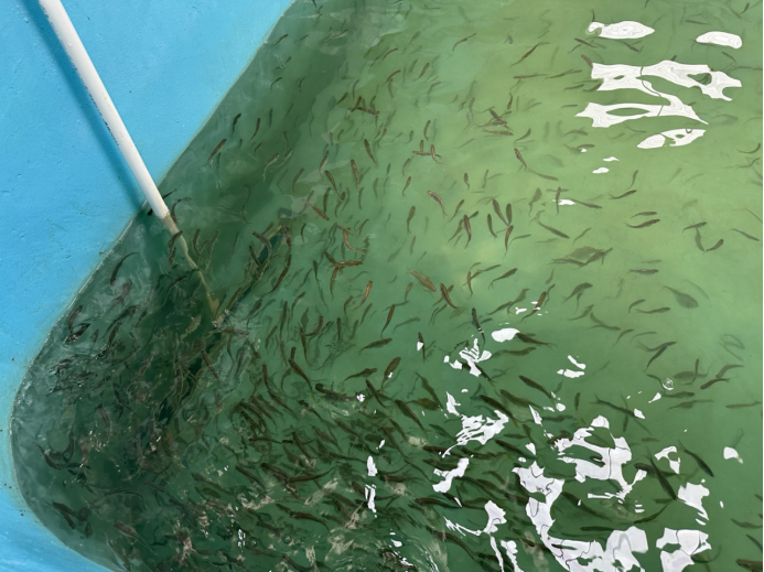 专家组查阅了生产记录,进行了随机抽样,测量统计了苗种规格与苗种数量,听取了项目组关于四指马鲅大规格苗种室内工厂化培育的工作汇报。项目组通过生态调控促使池养四指马鲅亲鱼自然产卵的方法,2023年8月15日获得优质受精卵1.5kg,经优选后进行室内工厂化育苗。通过现场抽样测量,四指马鲅平均体长6.7cm(体长范围:5.4-7.6cm),育成苗种3.16万尾,苗种成活率33.4%。