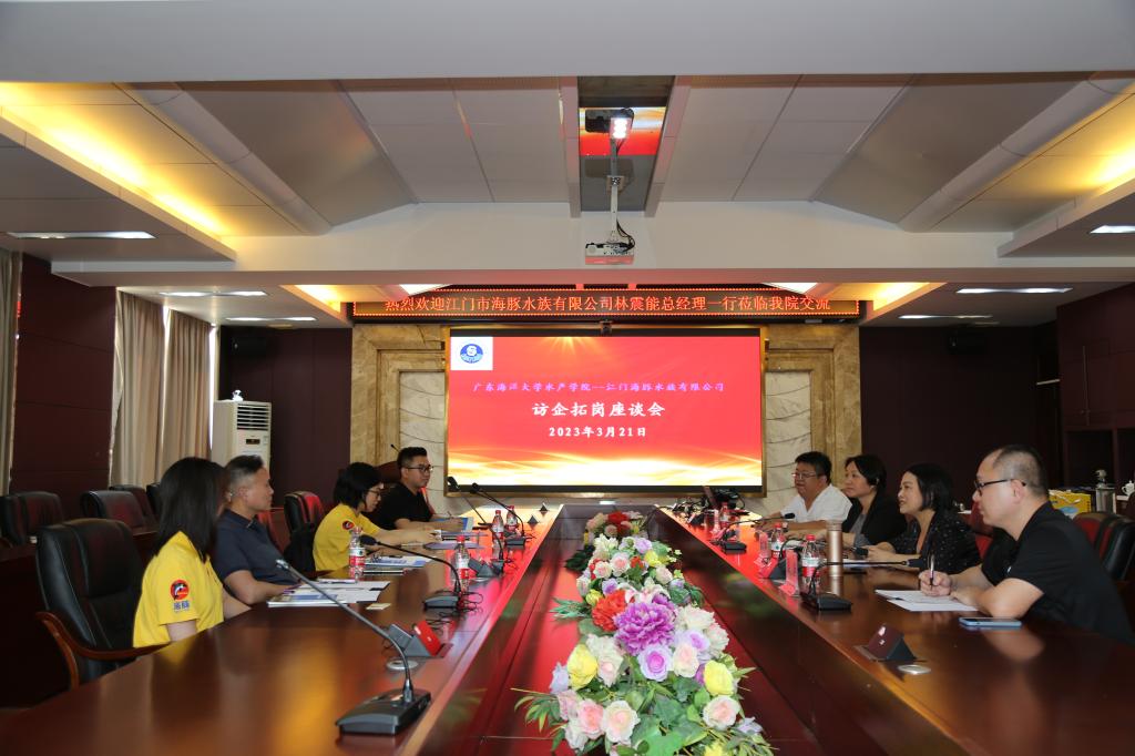 3月21日, 江门市蓬江区海豚水族有限公司林震能董事长一行回访william威廉中文官网,经理李广丽、副经理杨奇慧、海渔系主任王学锋、水医系副主任蔡佳及党政办主任孔沛球等出席座谈会。