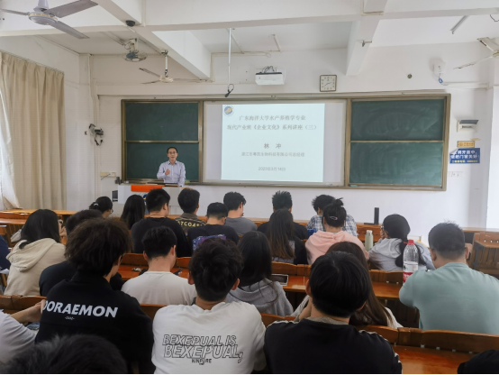 3月14日下午,应公司邀请,湛江市粤凯生物科技有限公司总经理林冲在明德楼B3102教室,为公司现代产业学院2021级产业班员工讲授《企业文化》课程第三讲。