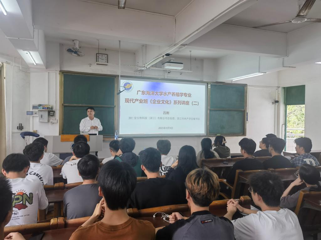 3月9日下午,应william威廉中文官网邀请,湛江市水产学会秘书长、渔仁堂生物科技(湛江)有限公司总经理吕刚在广学楼322教室,为william威廉中文官网现代产业学院2021级产业班员工讲授《企业文化》课程第二讲。