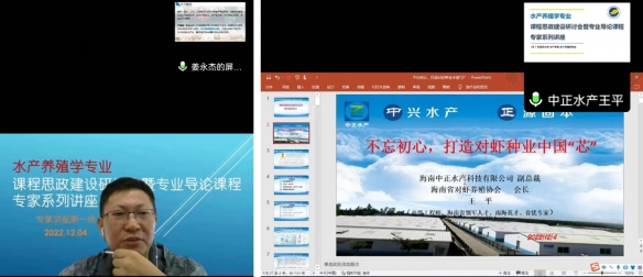 2022年12月3日,通过腾讯会议线上形式,水产养殖学专业举办课程思政研讨会暨专业导论课程专家系列讲座。学院副经理杨奇慧、水产养殖系主任王忠良、副主任黄建盛、部分老师及2022级全体同学共200余人参会。会议由黄建盛主持。