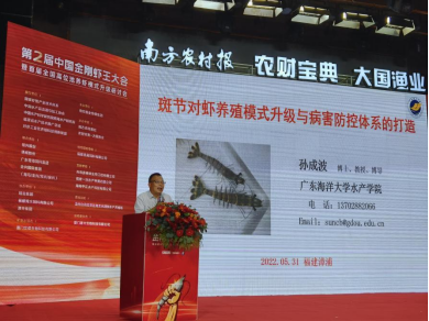 漳浦是我国金刚虾主要养殖区,单产最高达到15000斤/亩,中国金刚虾大会已在福建漳浦连续举办两年,公司孙成波教授连续两届受邀参加并作主题报告,2021年第一届报告题目“斑节对虾(金刚虾)高密度养殖常见病害与环境控制”,本届大会报告题目“金刚虾(斑节对虾)养殖模式升级与病害防控体系的打造”。通过构建对虾地膜池硬件设施化工程化技术体系、养殖尾水减排技术和对虾高位池养殖尾水处理技术,促进金刚虾养殖模式升级和对虾产业可持续发展。孙成波教授连续2年应邀参会并作主题报告,极大地提高了学校、学院的知名度及影响力,助力公司水产学科更好更快地发展。
