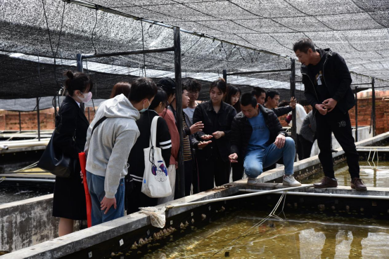 在采风调研途中,团队走访了几家已有过合作关系的养殖场,由养殖户带领参观场内养殖设施及养殖的东风螺等,期间吕文刚博士还不忘向团队成员介绍东风螺的养殖及其习性特点等。同时团队成员们也认真地听讲及记录,不断获取相关信息。