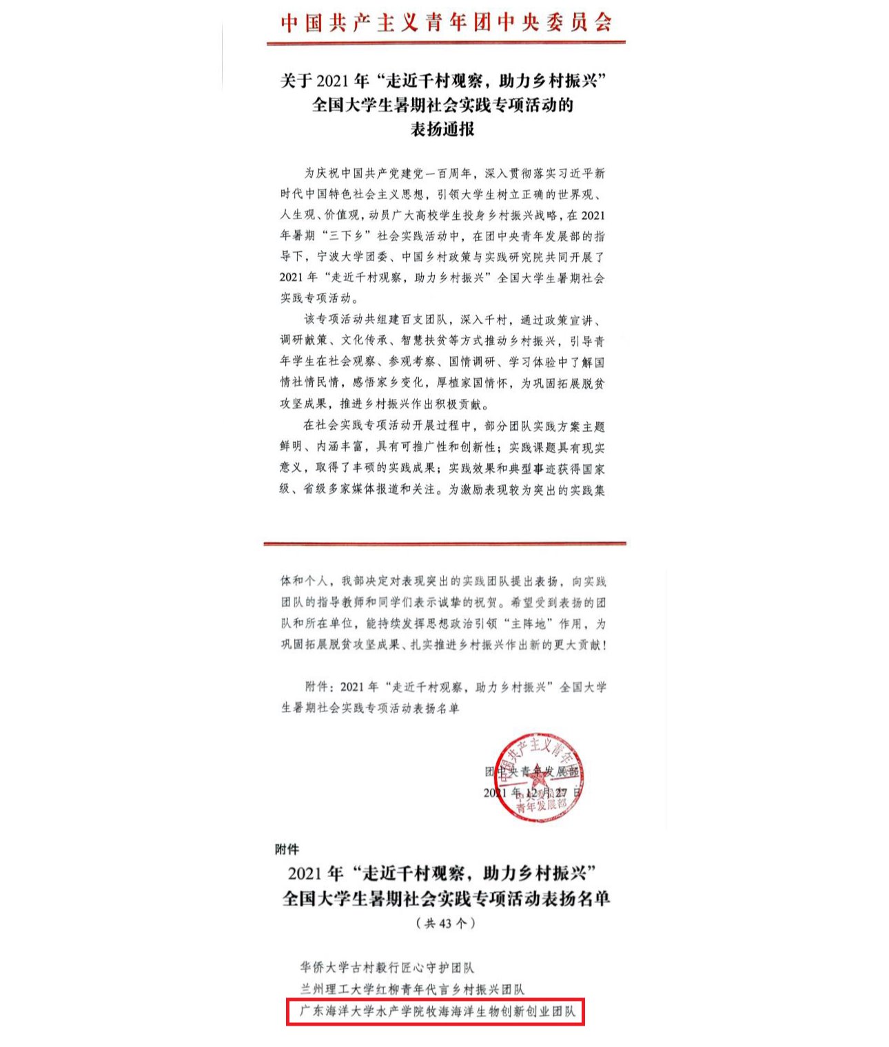 近日,公司牧海海洋生物创新团队受团中央发文表扬,此次团中央发文表彰2021年“走近千村观察,助力乡村振兴”全国老员工暑期社会实践专项活动,广东省共有3所高校受到表彰,公司是其中之一。