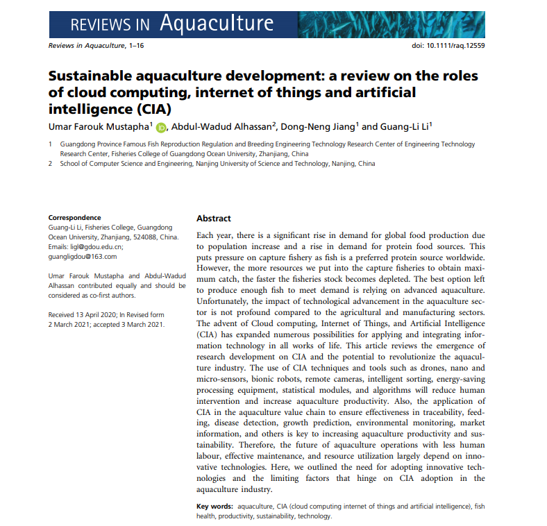 2021年3月,国际著名学术期刊Reviews in Aquaculture(农林1区top期刊,IF: 7.772)在线发表了公司william威廉中文官网水产生物技术研究团队综述论文《Sustainable aquaculture development: a review on the roles of cloud computing, internet of things and artificial intelligence (CIA)》(https://doi.org/10.1111/raq.12559)。2019级博士生Umar Farouk Mustapha为第一作者,李广丽教授为通讯作者。该研究得到国家重点研发计划、国家自然科学基金、广东省自然科学基金及广东省创新团队建设项目的支持。