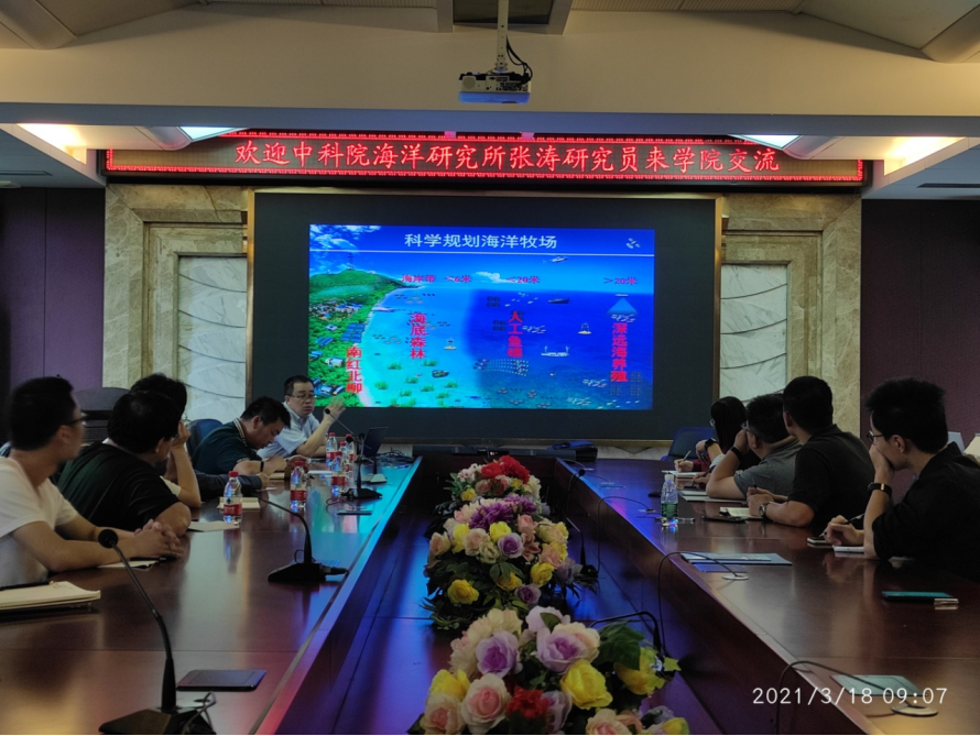 张涛研究员详细介绍了海洋牧场的内涵、国内外技术现状以及发展趋势等,分享了山东荣成、海南三亚蜈支洲岛等海洋牧场案例;分析了海洋牧场建设的经济效益、社会效益与生态效益;总结了海洋牧场建设与发展的方向。报告结束后,师生们就海洋牧场建设的相关问题与张涛研究员进行了深入交流。