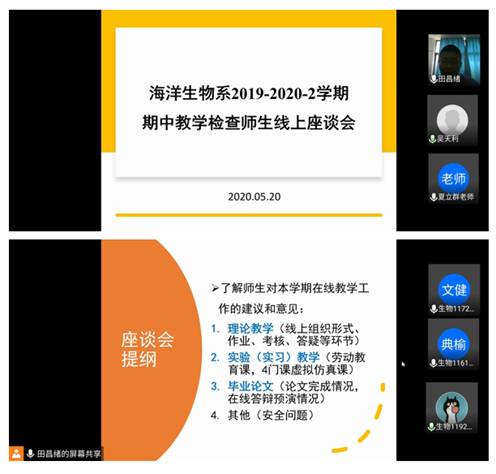5月20日下午,海洋生物系在腾讯会议平台召开2019-2020-2学期期中教学检查师生座谈会。海洋生物系李长玲教授、温崇庆教授、夏立群教授、江东能副教授和吴天利老师,以及2016、2017、2018和2019级各班班长和学习委员等20余名员工代表参加了本次座谈会。座谈会由海洋生物系副主任田昌绪老师主持。