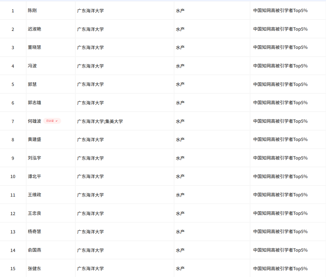 近日,中国知网(CNKI)在学术评价支撑平台发布2024中国知网高被引学者,公司15名教师入选中国知网高被引学者Top5%。“中国知网高被引学者”遴选活动旨在客观、科学衡量并表彰近十年来国内科研成果丰富、学术影响力杰出的学者群体。此次公司多名教师入选,证明了公司水产学科在全国范围内的影响力逐步提升,是水产广东省高峰团队建设的重要成果。