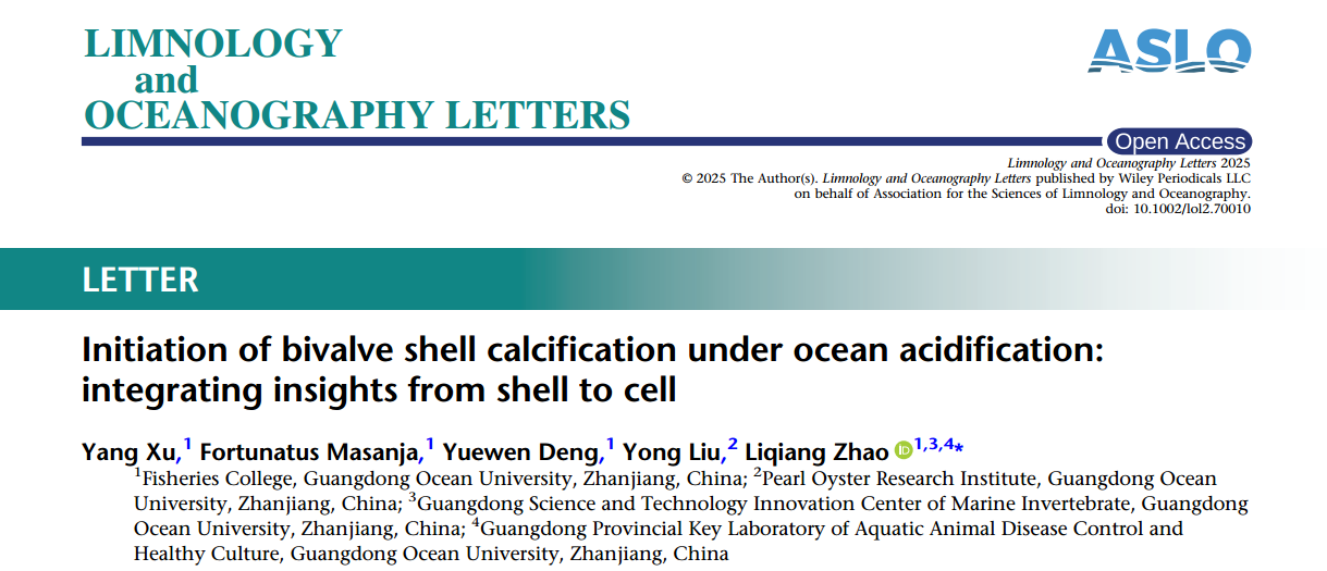 近日,公司贝类遗传育种与增养殖团队在海洋与湖沼领域顶级期刊《Limnology and Oceanography Letters》(中科院大类1区,IF=5.1)发表了题为“Initiation of bivalve shell calcification under ocean acidification: integrating insights from shell to cell”的研究论文。该研究聚焦海洋酸化对贝类幼虫初始钙化的影响,创新性地结合显微观测、元素/同位素示踪、组学分析等多模态技术,系统解析了酸化环境下贝类胚壳形成的关键机制及其适应策略。