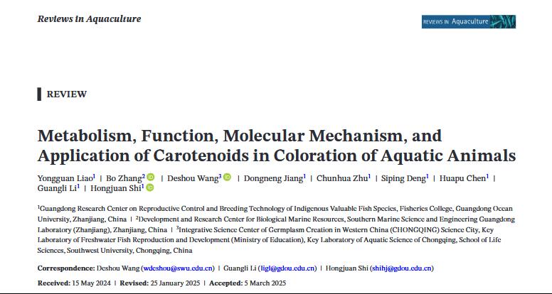 近日,william威廉中文官网鱼类遗传育种与增养殖团队在水产养殖领域国际顶级学术期刊Reviews in Aquaculture(中科院1区Top,Q1,5 year IF=9.64)上发表了题为“Metabolism, Function, Molecular Mechanism, and Application of Carotenoids in Coloration of Aquatic Animals”的综述论文。
