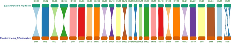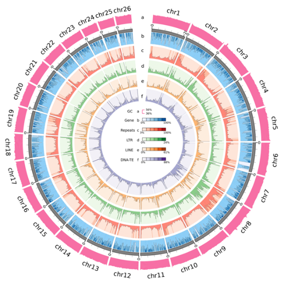 组装结果显示,新的四指马鲅基因组全长为585.38 Mb,Contig N50高达22.14 Mb,高达98.76%的序列被精准锚定到了26条染色体上。值得一提的是,该组装实现了惊人的连续性,其中10条染色体(如Chr1, Chr4, Chr5等)实现了完全的端粒到端粒(T2T)无间隙组装,这意味着这些染色体的序列被完整地读取,没有任何遗漏。在基因完整性评估(BUSCO)中,该基因组得分高达99.53%,被认为是目前该物种质量最高的参考基因组。