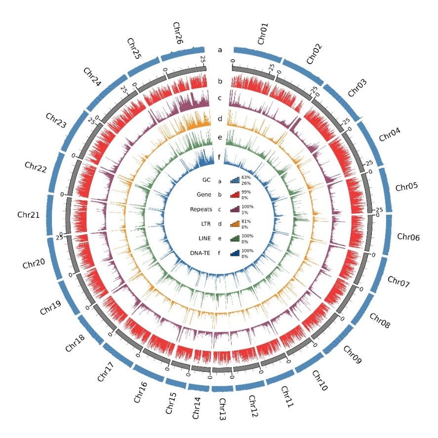 组装结果显示,多鳞四指马鲅的基因组全长为585.27 Mb,Contig N50达到24.22 Mb,高达99.73%的序列被精准锚定到了26条染色体上。基因组中约18.53%被识别为重复序列,并成功预测了23,090个蛋白编码基因。在基因完整性评估(BUSCO)中,该染色体水平组装的完整性得分高达99.05%,充分证明了该参考基因组的高质量与高完整度。
