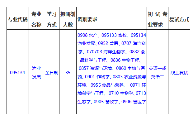 根据上级部门下达学校的指标,公司渔业发展专业尚有部分调剂名额,欢迎大家调剂,调剂基本要求见/info/1102/3312.htm。